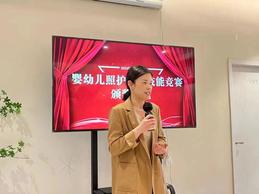 江苏省孕婴童用品协会常务副会长兼秘书长赵静为育婴员赛第一、二、三名颁奖。